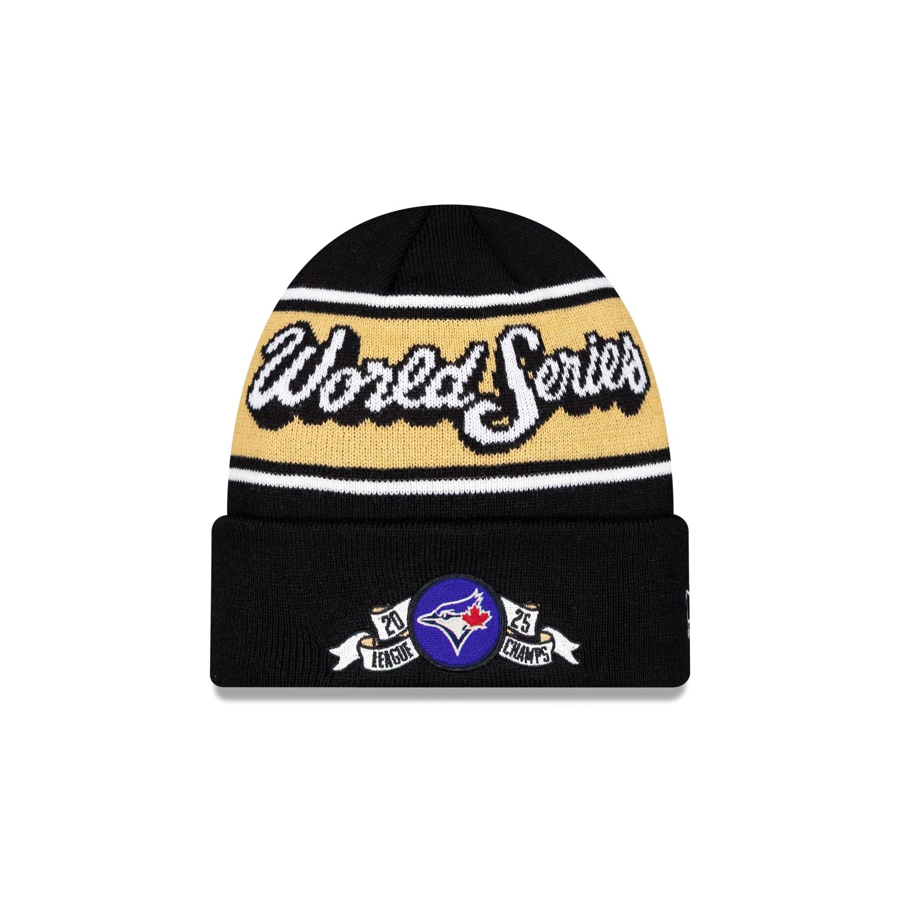 The Toronto Blue Jays 2025 League Championship Series Locker Room Beanie features an embroidered Blue Jays logo and World Series graphic at the front cuff with the MLB Batterman logo at the rear. Additional details include a World Series script wordmark at the crown.