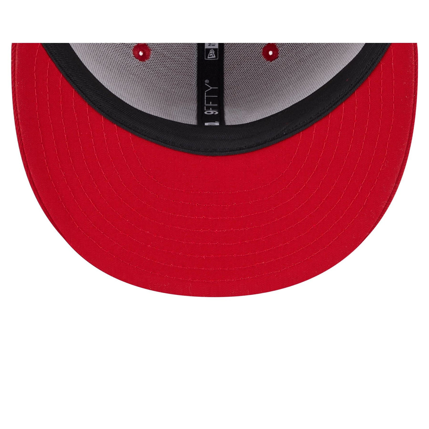 The Alpha Industries x Philadelphia Phillies Red 9FIFTY Snapback features a chainstitch embroidered Phillies logo at the front panels with an alternate team logo at the right-wear side, a signature Alpha Industries red ribbon at the left-wear side, and a snapback closure at the rear.