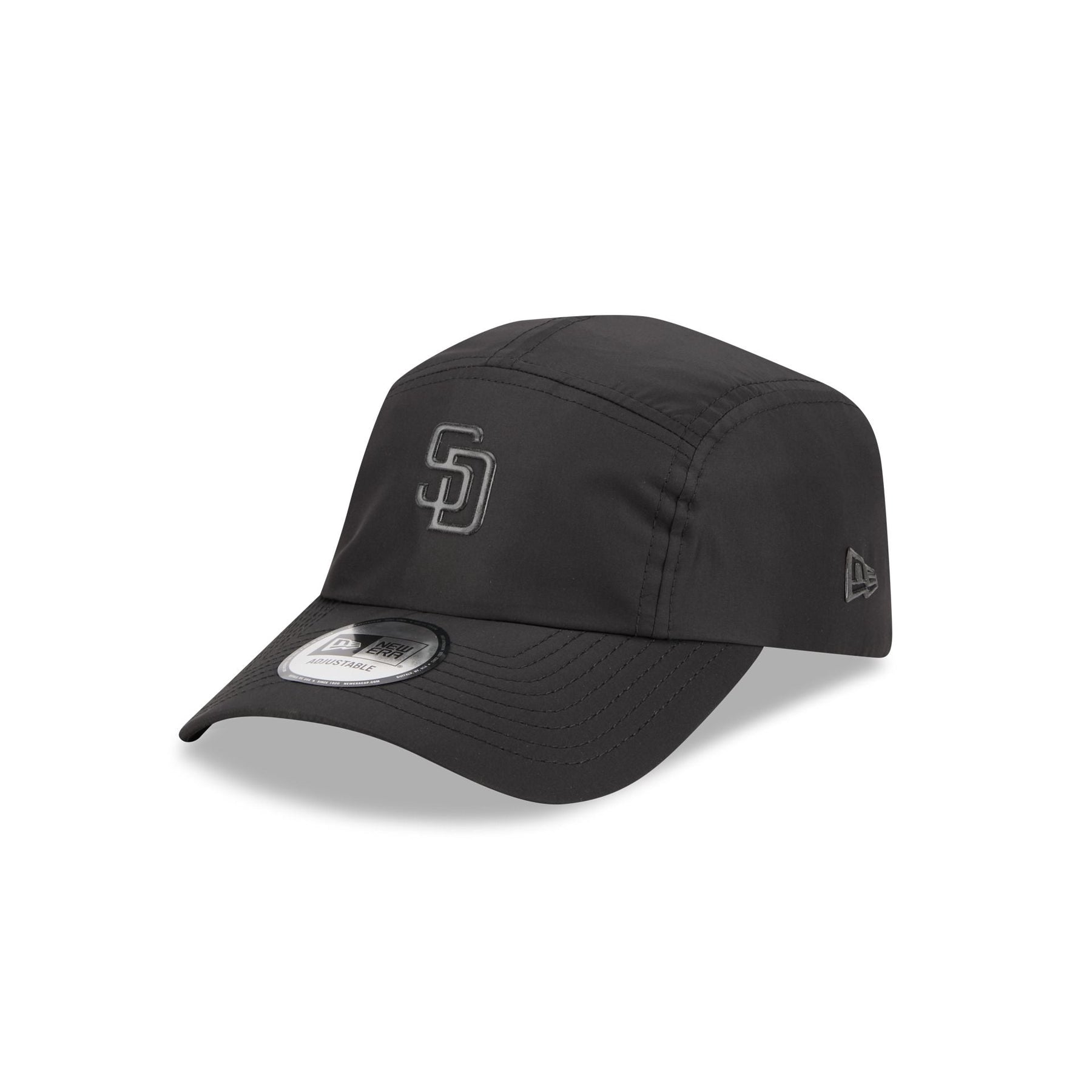 The Alpha Industries x San Diego Padres Black Runner Adjustable Cap features a silicone Padres logo at the front with a woven New Era Cap x Alpha Industries tag above an adjustable Alpha Industries red ribbon strapback closure at the rear.
