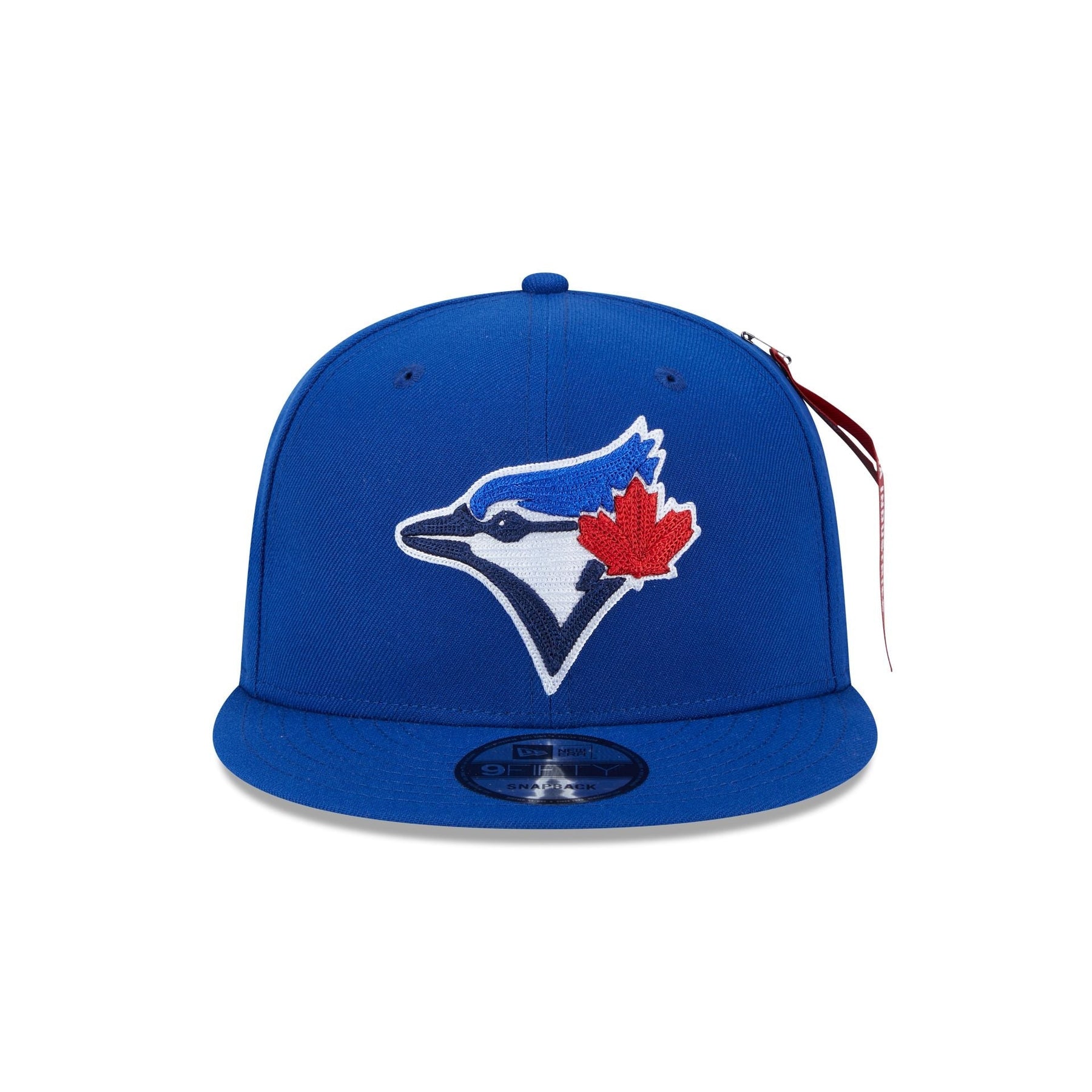 The Alpha Industries x Toronto Blue Jays Blue 9FIFTY Snapback features a chainstitch embroidered Blue Jays logo at the front panels with an alternate team logo at the right-wear side, a signature Alpha Industries red ribbon at the left-wear side, and a snapback closure at the rear.