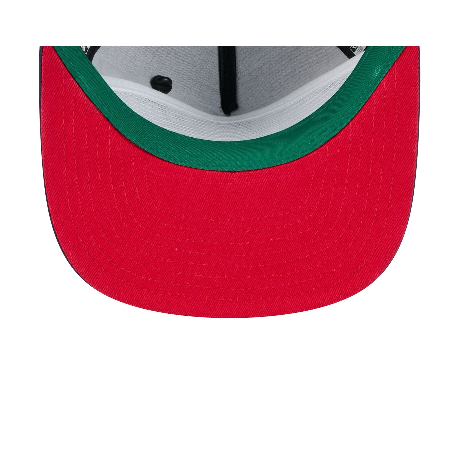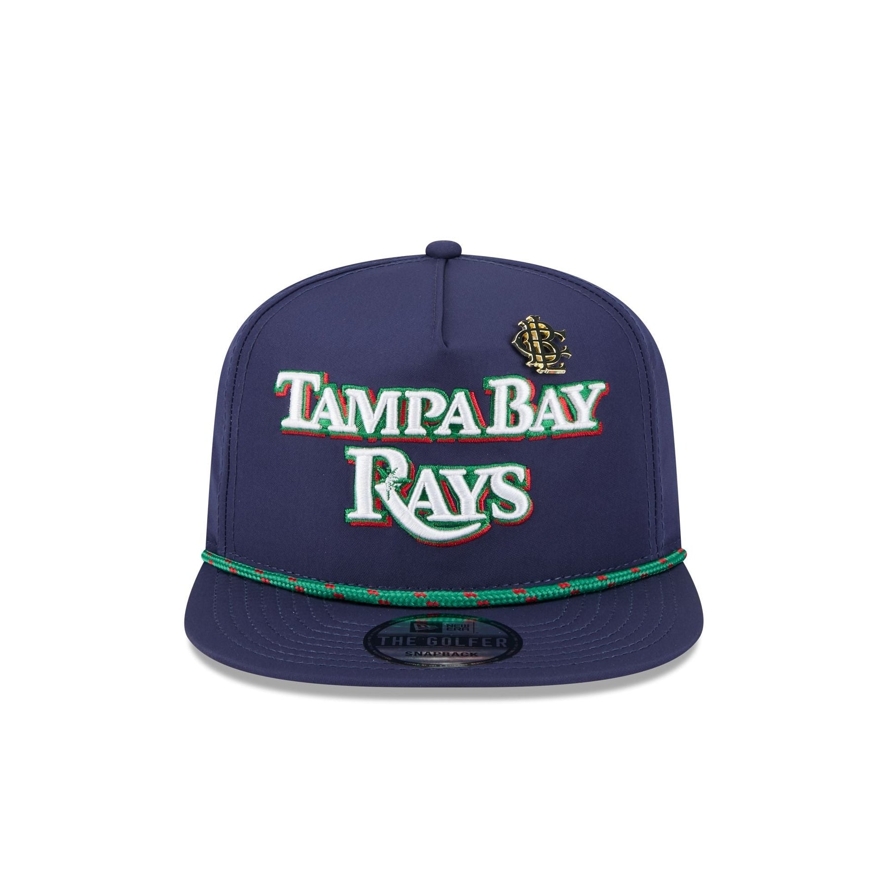 The Big League Chew x Tampa Bay Rays Golfer features an embroidered Rays wordmark and a Big League Chew pin at the front panel with an adjustable snapback closure at the rear and a red undervisor.