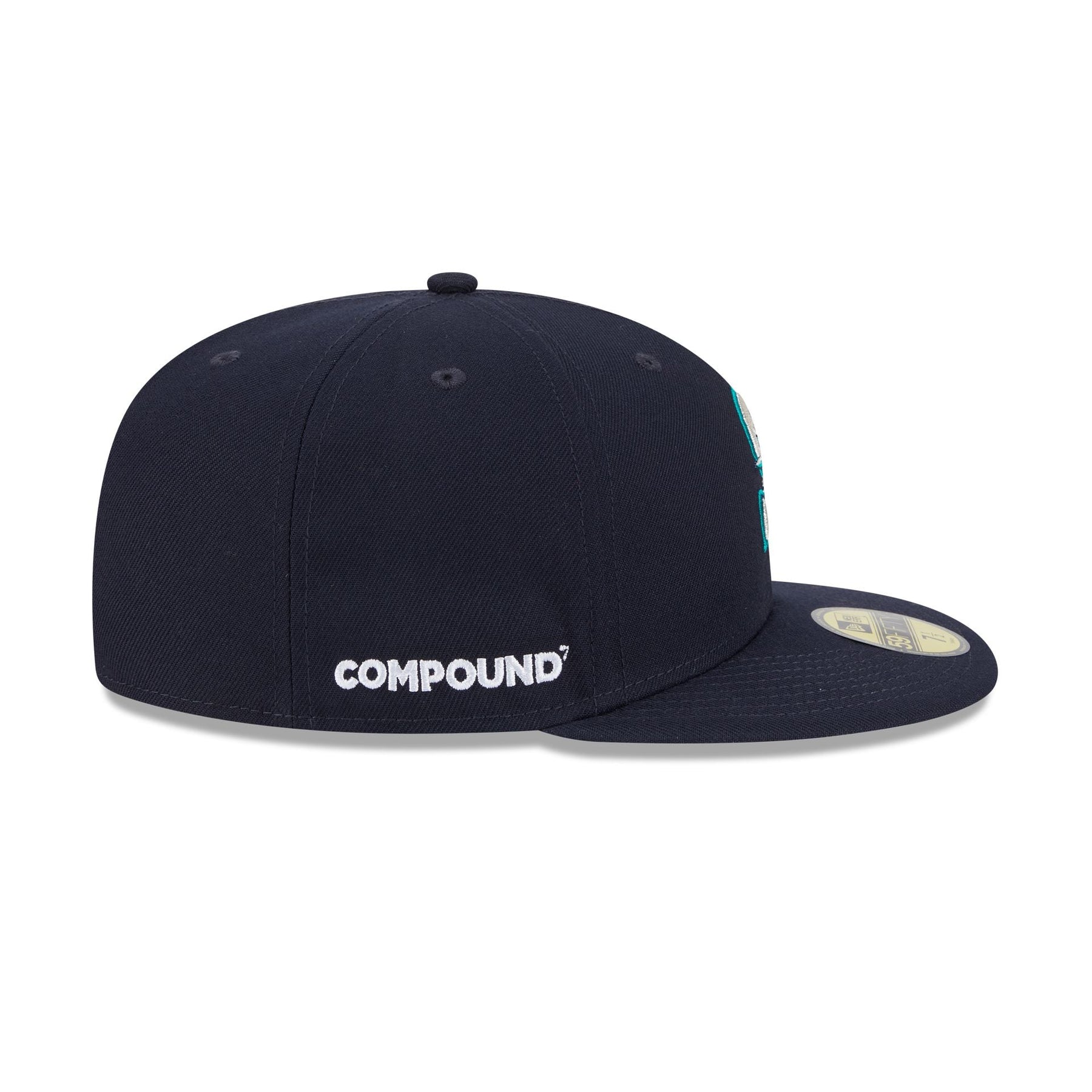 The Compound x Seattle Mariners 59FIFTY Fitted Cap features an embroidered Mariners logo at the front panels with a matching MLB Batterman logo at the rear, a Compound wordmark at the right-wear side, and a gray undervisor.