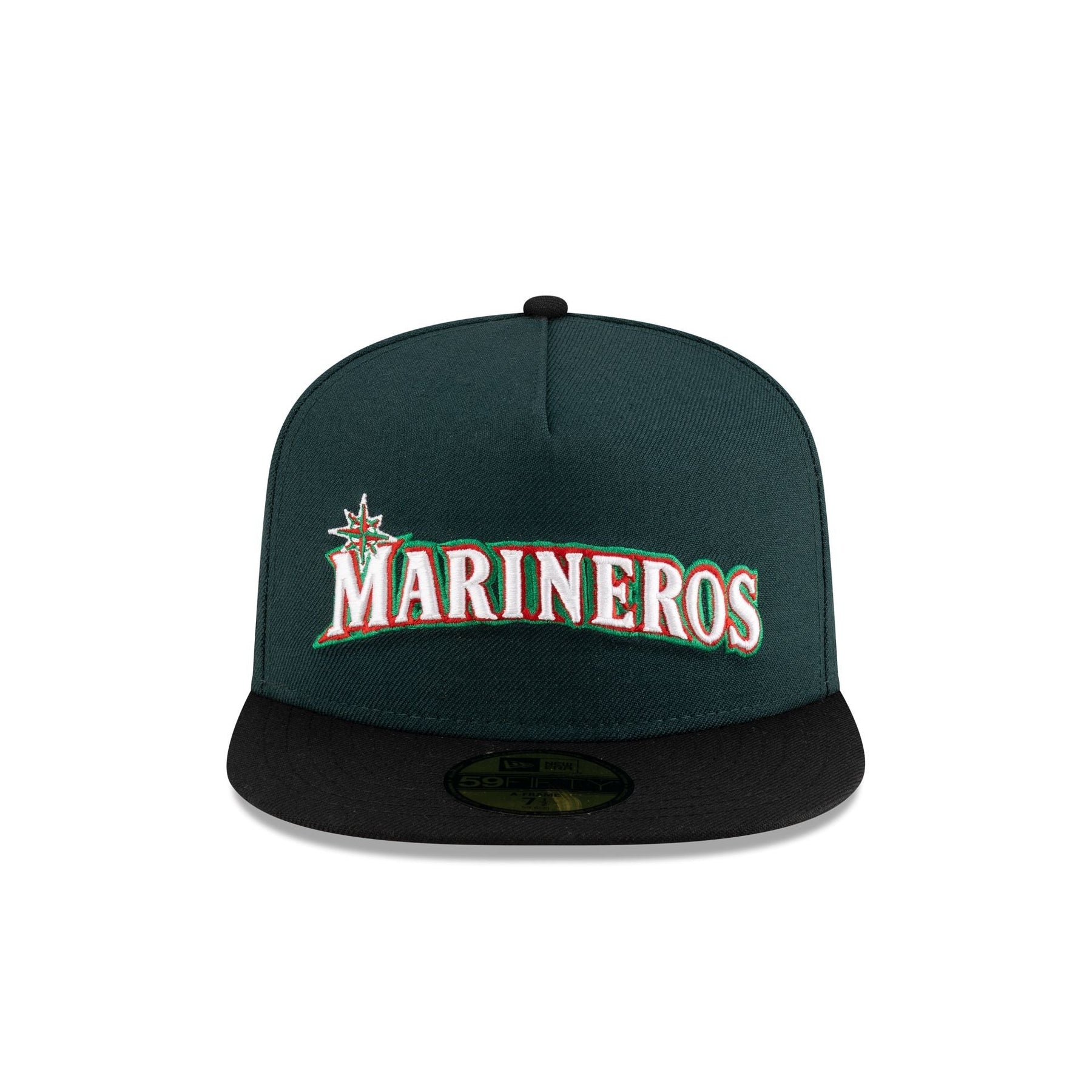 The Just Caps Cinco de Mayo Seattle Mariners 59FIFTY A-Frame Fitted Cap features an embroidered Marineros logo at the front panels with the Mexican flag at the right-wear side. Additional details include a matching Cooperstown MLB Batterman logo at the rear and gray undervisor.