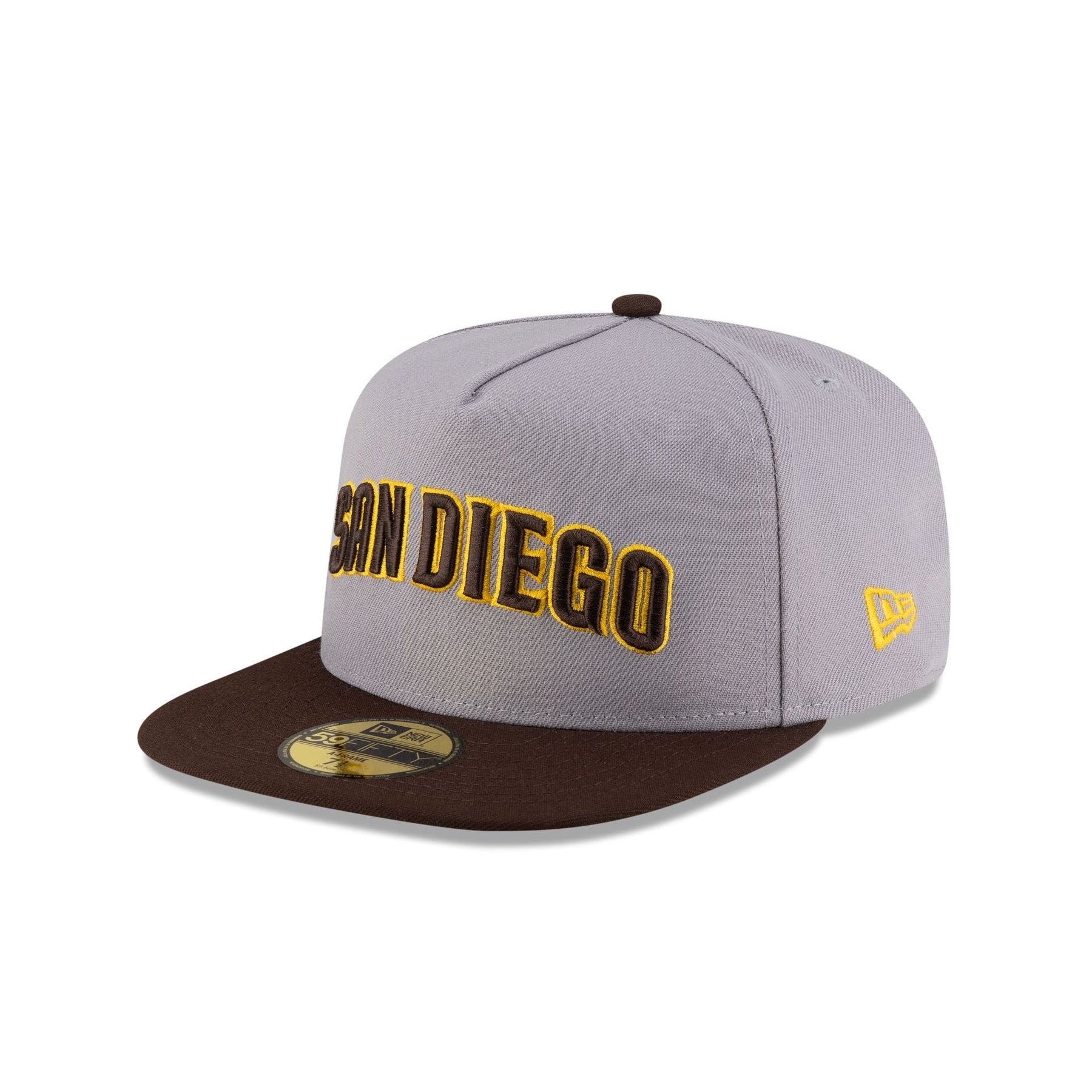 The Just Caps League Sidepatch Just Caps League Sidepatch Gray San Diego Padres 59FIFTY A-Frame Fitted Cap features an embroidered Padres logo at the front panels with a matching MLB Batterman logo at the rear. Additional details include a National League patch at the right-wear side and a green undervisor.