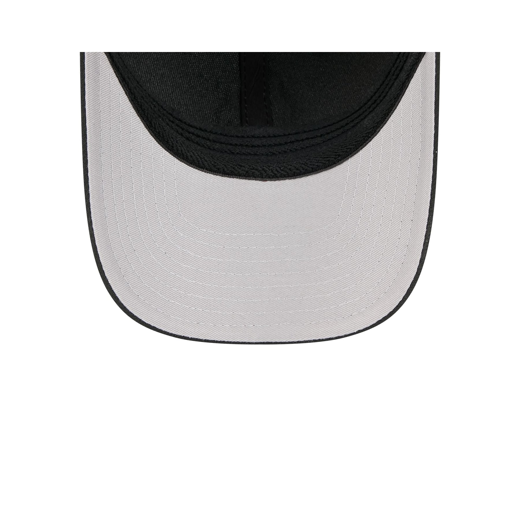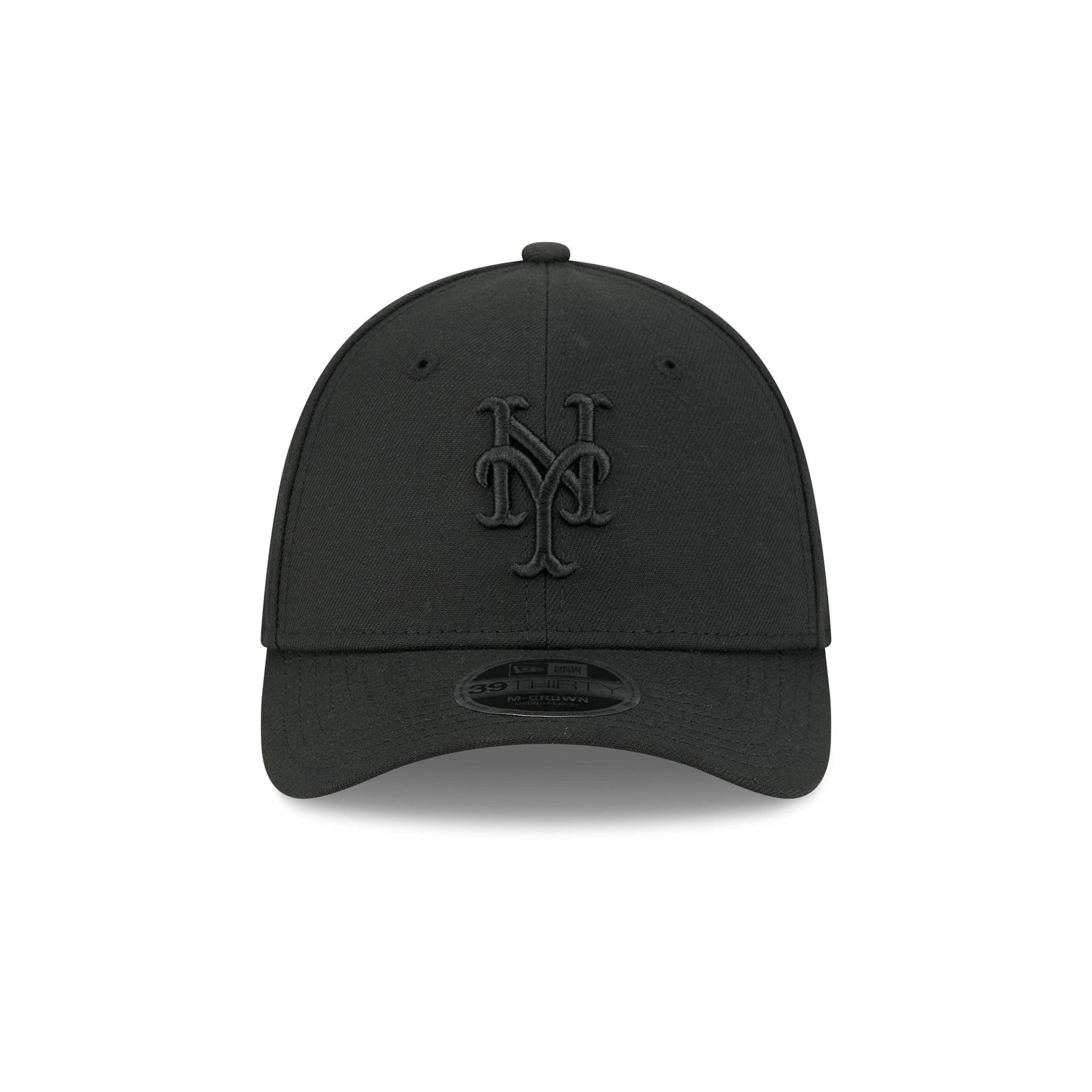 The New York Mets Black and White 39THIRTY M-Crown Stretch Fit Cap features an embroidered Mets logo at the front panels with a matching team wordmark at the rear and a gray undervisor. Additional details include a Performance Stretch sweatband and a New Era Flag at the left-wear side.
