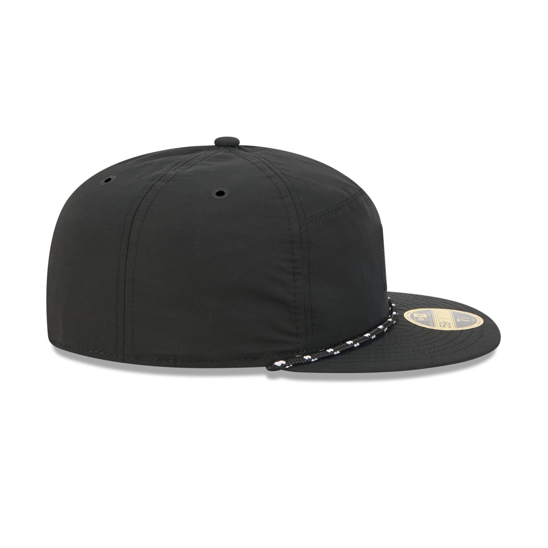 The New York Mets Black Poly Rope 59FIFTY Split Panel Fitted Cap features a woven Mets logo at the front panels with a matching MLB Batterman embroidered at the rear. Additional details include a rope at the visor and a gray undervisor.
