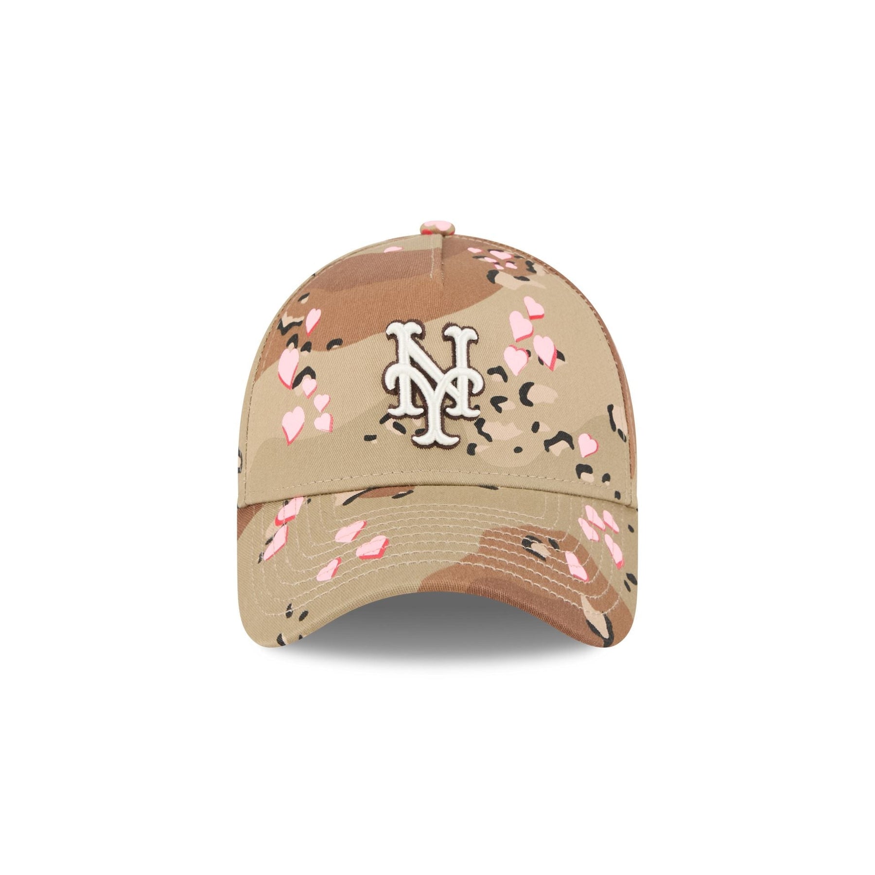The New York Mets Camo Hearts 9FORTY A-Frame Snapback features an embroidered Mets logo at the front panels against a camo and heart print pattern throughout. Additional details include an adjustable snapback closure at the rear and a pink undervisor.