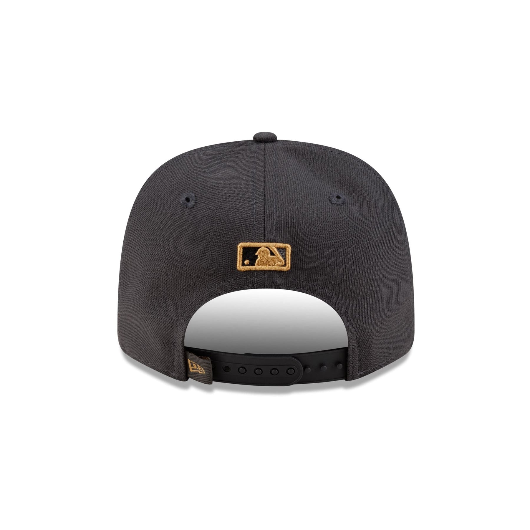 The Toronto Blue Jays 2025 ALDS Locker Room 9SEVENTY Stretch-Snap Cap features an embroidered Blue Jays logo with gold leaf accents at the front panels and a Postseason patch at the right-wear side. Additional details include a rope at the visor and the MLB Batterman logo above an adjustable stretch-snap closure at the rear.