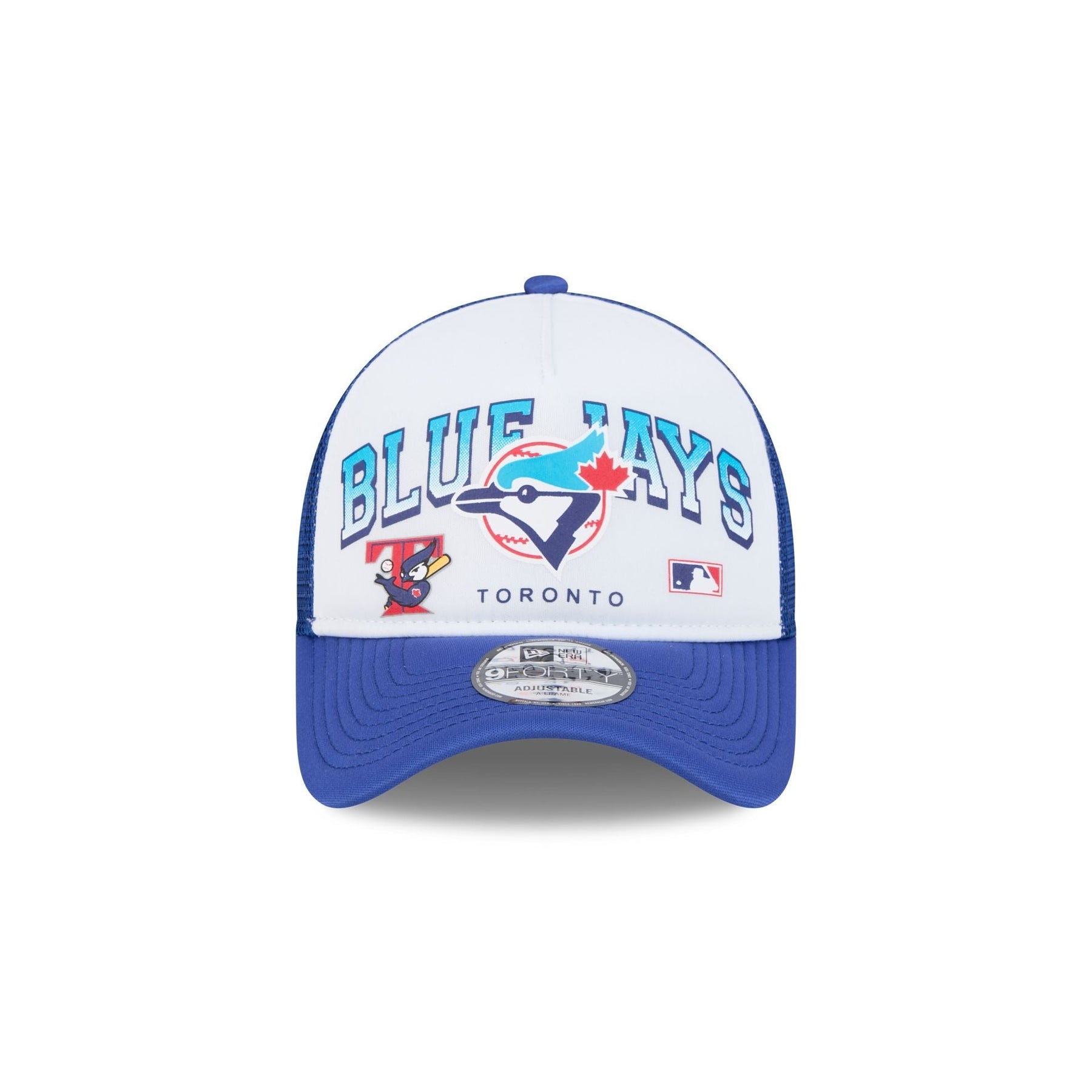 The Toronto Blue Jays Sport Classics 9FORTY A-Frame Trucker features a retro screen-printed Blue Jays wordmark at the front panels with a team logo at the left and an MLB Batterman logo at the right. Additional details include a mesh back, a gray undervisor, and a snapback closure at the rear.